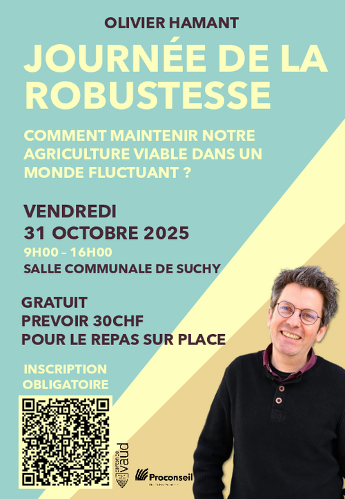 - Comprendre la notion de robustesse: explorer avec Olivier Hamant comment renforcer la capacité de l'agriculture vaudoise à faire face aux incertitudes et fluctuations actuelles et à venir.