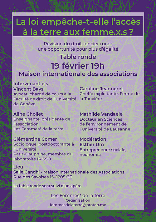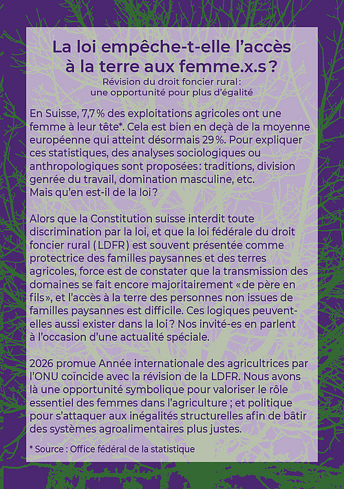 Cette première table ronde portera sur le difficile accès à la terre et au statut de « cheffe d'exploitation » pour les agricultrices et les filles de paysans en Suisse. Aujourd'hui, seules 7,7 % des exploitations agricoles sont dirigées par des femmes. Cette réalité sera mise en perspective avec la révision en cours de la Loi fédérale sur le droit foncier rural (LDFR), actuellement débattue au Parlement.