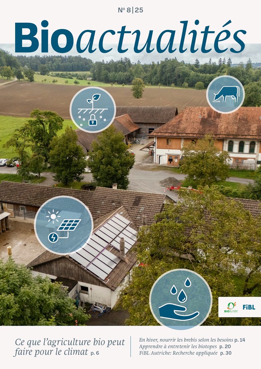 Le dernier numéro du magazine Bioactualités (8|25) est consacré à la protection du climat: il aborde la question du rapport entre l'agriculture biologique et le climat, présente les nouveaux groupes d'échange ProBio et explique comment les exploitations Bourgeon peuvent rendre leurs performances visibles grâce au check-up Climat. Plusieurs exemples concrets montrent comment les exploitations agricoles réduisent leurs émissions grâce à la gestion de l'eau, à l'agroforesterie ou à une durée de vie prolongée des vaches.