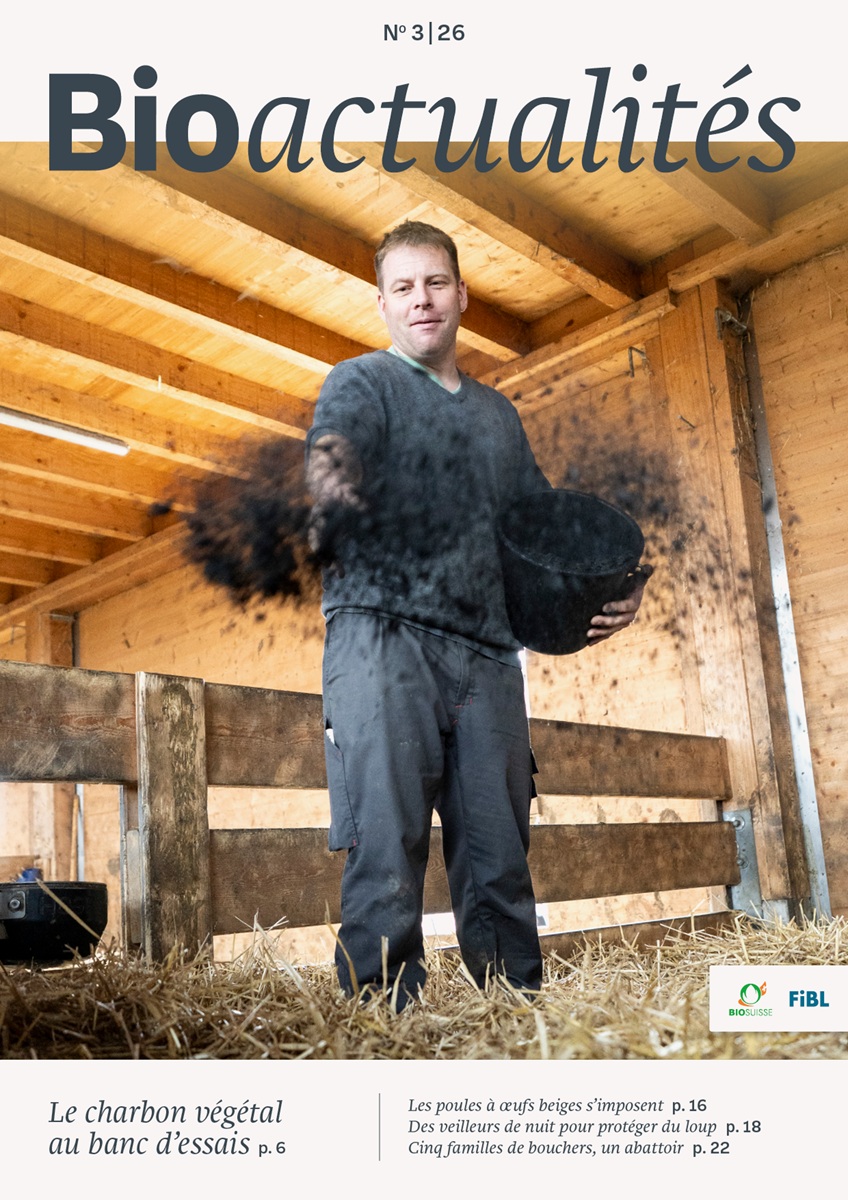 Les articles de fond de ce nouveau numéro du magazine Bioactualités (3|26) sont consacrés au charbon végétal. Ce matériau suscite de plus en plus de discussions dans l'agriculture – comme amendement, pour l'alimentation animale ou pour fixer des éléments nutritifs dans le fumier et le compost. Cependant le charbon végétal n'est pas autorisé dans l'alimentation animale de l'agriculture bio, et son utilité dans le sol est scientifiquement controversée. Ce thème principal présente les conditions-cadres réglementaires, des résultats de recherches actuelles et des expériences pratiques faites par les producteur·trices. Des interviews avec des experts mettent lumière les chances et les limites.