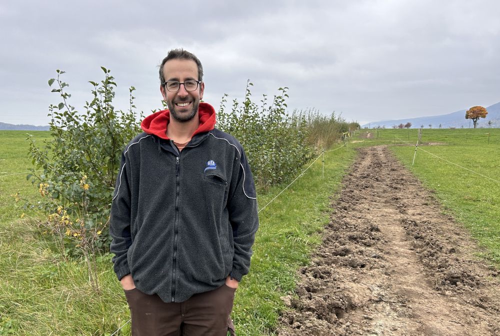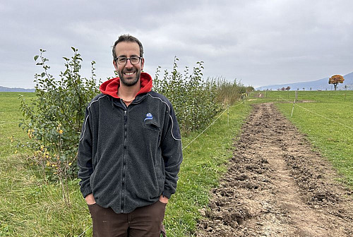 Hugues Maurer exploite en famille la ferme de Combazin, au Landeron (NE), où il pratique l'agroforesterie depuis plusieurs années (photo Claire Berbain, FiBL).