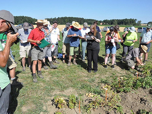 Inévitablement, le premier thème abordé fut la sécheresse. « Pour nous, ce n'est pas l'eau qui est le problème, mais plutôt les hautes températures », affirma Daniel Hangartner, de Rathgeb bio. Il faut dire que Rathgeb bio est bien installé pour irriguer ses cultures. Malgré cela, dans les terres noires, la température des tubercules a pu monter jusqu'à 60 °C ; les tubercules le plus en haut dans la butte cuisent presque dans le sol et sont invendables. Pour compenser les grosses pertes attendues, Rathgeb bio va replanter ces jours-ci quelques hectares de Charlotte.