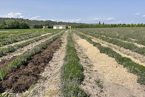 Depuis 2023, le FiBL France, en partenariat avec le CRIEPPAM, l'Iteipmai et la Chambre d'agriculture de la Drôme, mène le projet RésiLav (financé par Union européenne et la Région Auvergne-Rhône-Alpes) pour explorer une approche agroécologique innovante : l'utilisation de paillages issus de coproduits de la distillation (paille de lavande, vert broyé) ainsi que du miscanthus.