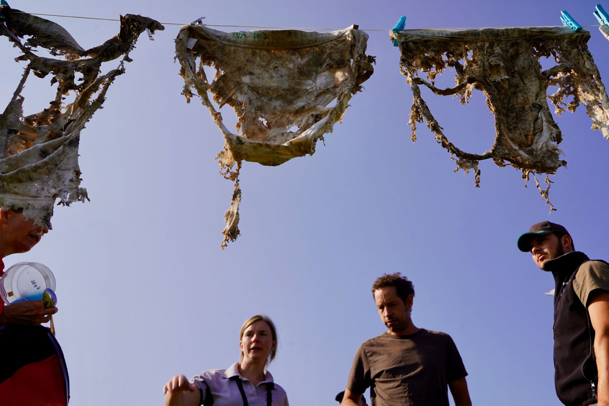 Sur le pôle thématique "Sol", de nombreuses animations ont montré quelles étaient les possibilités pour les agriculteurs, travaillant individuellement ou en groupes d'intérêt, d'apprécier l'état de leurs sols et de définir les moyens qui permettent de l'améliorer. Le test des slips était spectaculaire (voir photo): il consistait à mettre sous la terre des slips neufs durant 3 ou 4 mois dans diverses parcelles, puis de les ressortir pour évaluer leur état de décomposition. Simple et bon marché, ce test peut donner une appréciation qualitative approximative de la vie biologique qu'il y a dans un sol donné.