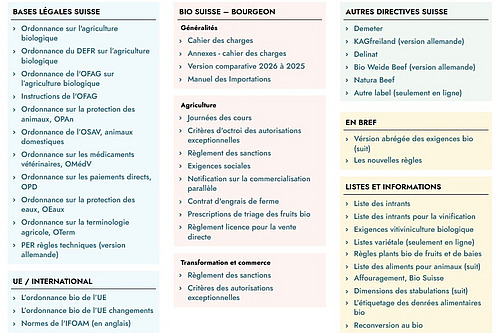 Outre les bases légales et les directives des différentes associations bio, la réglementation bio comporte de nombreuses publications, régulièrement mises à jour par le FiBL: