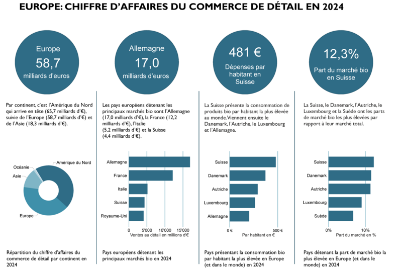 En 2024, l'Allemagne représentait toujours le premier marché bio d'Europe (17,0 milliards d'euros), devant la France (12,2 milliards d'euros) et l'Italie (5,2 milliards d'euros). Le chiffre d'affaires du commerce de détail bio en Europe atteignait 58,7 milliards d'euros (UE: 49,5 milliards), soit une augmentation de 4,1 % en Europe et de 3,6 % dans l'Union européenne. La Suisse enregistrait la consommation d'aliments bio par habitant·e la plus élevée au monde, avec 481 euros par personne, et détenait la part de marché bio la plus importante au monde, avec 12,3 % des ventes totales de denrées alimentaires en 2024.