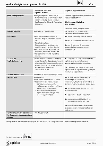 Ce document résume toutes les directives bio (de la Confédération , de Bio Suisse ou de Demeter) sous forme tabellaire.
