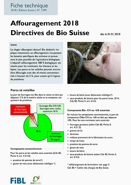 Bio Suisse veut faire en sorte que son slogan : Si le bio est dessus, le bio est dedans » soit encore plus crédible. L'objectif d'une alimentation à 100 % bio pour les ruminants, les chevaux et les lapins est atteint. Les porcins et la volaille peuvent encore être nourris avec au maximum cinq pourcents de fourrages non bio, pour autant qu'il s'agisse de composants protéiques La fiche technique de trois pages explique les détails de cette réglementation.