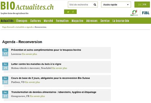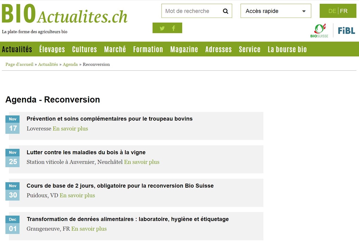 Pour les reconversions qui commencent en 2021, le nombre minimum de jours de cours de reconversion va passer de 2 à 5, par rapport à celles de 2020. Ces cours doivent permettre aux producteurs en voie de certification bio d’accéder aux connaissances de base nécessaires au bon fonctionnement de leur entreprise. Une multitude de cours est donc proposée par les différentes institutions et cantons couvrant la plupart des branches de production, de transformation et de commercialisation. Afin d’avoir une vue d’ensemble de l’offre, les cours comptant pour ces 5 jours ont été compilés et listés au même endroit sur Bioactualites.ch sous l’onglet Agenda > Reconversion.
