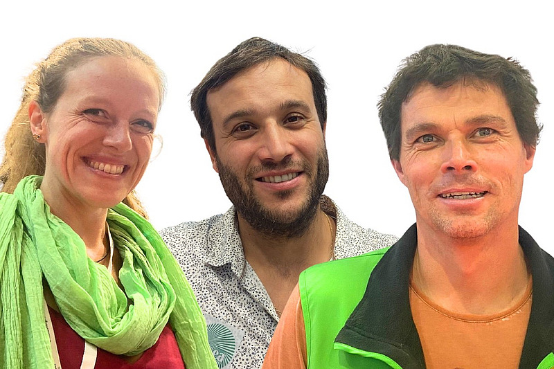 Rencontres à la plus grande foire agricole française: De g. à dr., Coralie di Bartolomeo, Jordan Magnet et Nathanaël Jaquart (Photo et montage Adrian Krebs, FiBL)