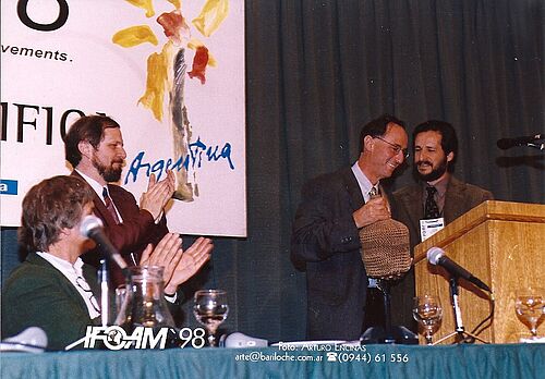 Conférence de l’IFOAM en 1997 à Mar del Plata, Argentine. Le FiBL a été chargé d’organiser la conférence de l’IFOAM de l’an 2000 (de g. à dr. Hervé La Prairie, président de l’IFOAM, Bernward Geier, directeur de l’IFOAM, Urs Niggli et Guillermo Schnitman, président du MAPO, le mouvement bio argentin). Photo: Arturo Encinas