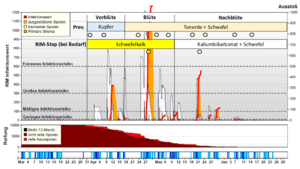 Le point fort de RIMpro est la modélisation des éjections d’ascospores conduisant ou non à des risques d’infection (valeur RIM donnée par la courbe rouge sur le graphique). Grâce à ces données, il est possible au printemps d’identifier et de quantifier les périodes d’infections primaires, qui sont déterminantes pour l’efficacité de la lutte. Elles sont essentielles pour le succès ou l’échec de la lutte contre les infections d’été (conidies d’été).
