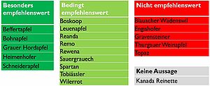 Les variétés Boskoop, Leuenapfel, Reanda, Remo, Rewena, Sauergrauech (pomme raisin), Spartan, Tobiässler et Wilerrot ne sont que partiellement recommandées. La variété Boskoop s’est montrée très sensible à Marssonina, Reanda, Remo et Rewena présentent une faible vigueur dès l’entrée en production, Sauergrauech est très sensible à la tavelure et au feu bactérien et est sujette à la chute prématurée des fruits. Suivant le site, Spartan a besoin d’une protection phytosanitaire accrue, Tobiässler est sensible au feu bactérien et à la tavelure et on reproche à Wilerrot sa tendance parfois marquée à l’alternance ainsi que sa récolte tardive (fin octobre à début novembre).