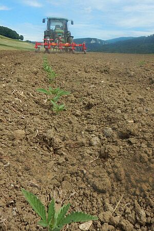 En raison de la faible densité de semis du chanvre CBD, la régulation des adventices est d’une grande importance. Plusieurs sarclages soigneux sont souvent nécessaires. (Photo: FiBL, Christian Hirschi)