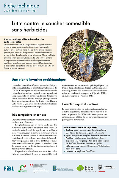 Depuis des années, le souchet comestible se propage dans les régions arables et maraîchères suisses, favorisé par le changement climatique. Cette plante très compétitive peut entraîner d'importantes pertes de rendement, en particulier dans les cultures estivales. Cette espèce envahissante se multiplie principalement par des tubercules. Ceux-ci sont transportés avec de la terre excavée et l'utilisation de machines entre exploitations. La lutte contre cette plante est très difficile, c'est pourquoi la prévention de son introduction, sa détection précoce et sa lutte sont décisives. La présence de souchet comestible en Suisse et au Liechtenstein doit être signalée et combattue.