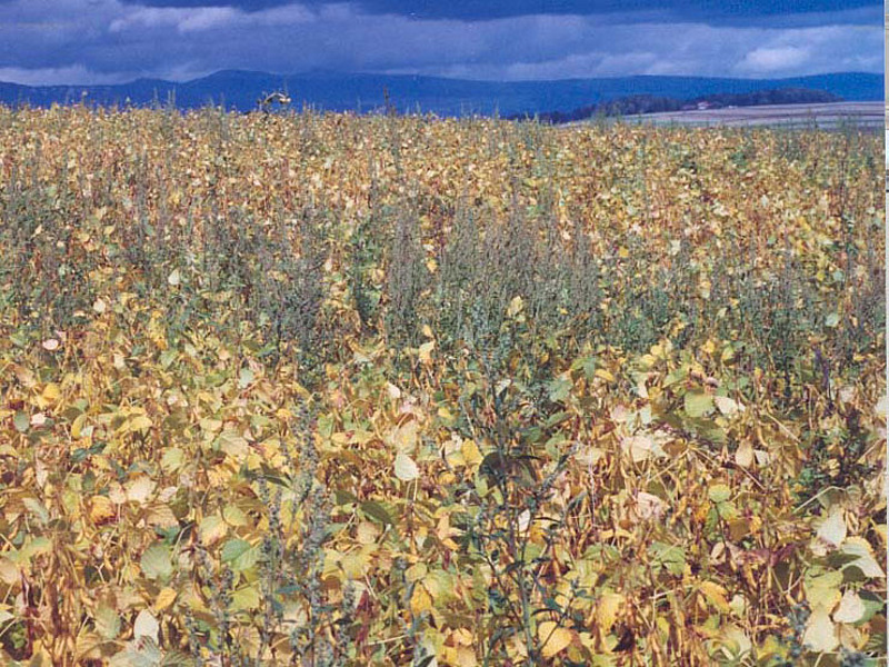 Hampes florales de chénopodes dépassant le soja peu avant la récolte du soja. Les graines de chénopodes peuvent survivre durant 6 à 8 ans dans le sol. (Photo: (c) FiBL, Maurice Clerc)