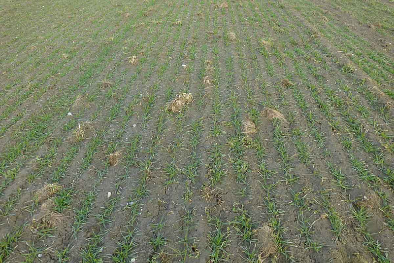 Sur les bandes 1 et 2, j’ai utilisé en automne 2014 un vibroculteur muni de petites pattes d’oie. Cela ne se révéla pas idéal, car ces pattes d’oie ont ressorti des mottes d’herbe qui ont concurrencé quelque peu le blé.