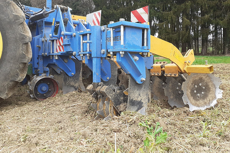 «Avoir une charrue superficielle dans mon parc de machines était aussi devenu plus important à cause de la demande de la clientèle après que les contributions pour le travail réduit du sol aient été introduites dans l'Ordonnance sur les paiements directs en 2014», dit Herbert Schär. Il travaille actuellement avec sa charrue superficielle modifiée. Une béquille à roue montée à l'avant permet de régler plus précisément la profondeur à 10 centimètres. Des socs plus larges et des coutres plus courts permettent une qualité de travail aussi bonne qu'avec un labour traditionnel. Travailler souvent à la même profondeur a cependant fait apparaître une semelle de labour. Cela a amené Herbert Schär à s'occuper davantage du sous-sol et à effectuer un sous-solage partiel avec un paragrubber qui ne détruit pas les structures formées au fil des ans.