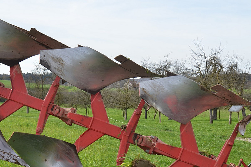 Herbert Schär a commencé à amasser des expériences dans le travail réduit du sol en 1997, d'abord avec un cultivateur à ailettes. On avait alors de la peine à trouver des machines adéquates. Il a donc adapté des machines d'occasion en fonction de ses besoins. Le but était de travailler toute la surface du sol, mais seulement en surface. Cela a permis à Herbert Schär de réduire fortement les mauvaises herbes pérennes, mais les graminées indésirables se sont multipliées après quelques années. Il a donc construit en 2015 à partir de deux charrues trisocs une charrue quadrisocs qui lui permettait de labourer superficiellement afin de mieux contrôler les graminées.