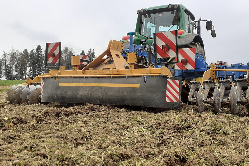 Dans les grandes cultures, Herbert Schär renonce depuis près de trois décennies au labourage profond et mise sur des voies de passage permanentes qui restent les mêmes au fil des ans, ce qu'on appelle le Controlled Traffic Farming (CTF). Herbert Schär fait aussi des travaux pour tiers à titre de revenu accessoire. Entre autres du travail du sol avec une fraise agricole déchaumeuse en combinaison avec un broyeur frontal, mais aussi des sous-solages à une profondeur de 25 à 45 centimètres avec une sous-soleuse de type paragrubber.