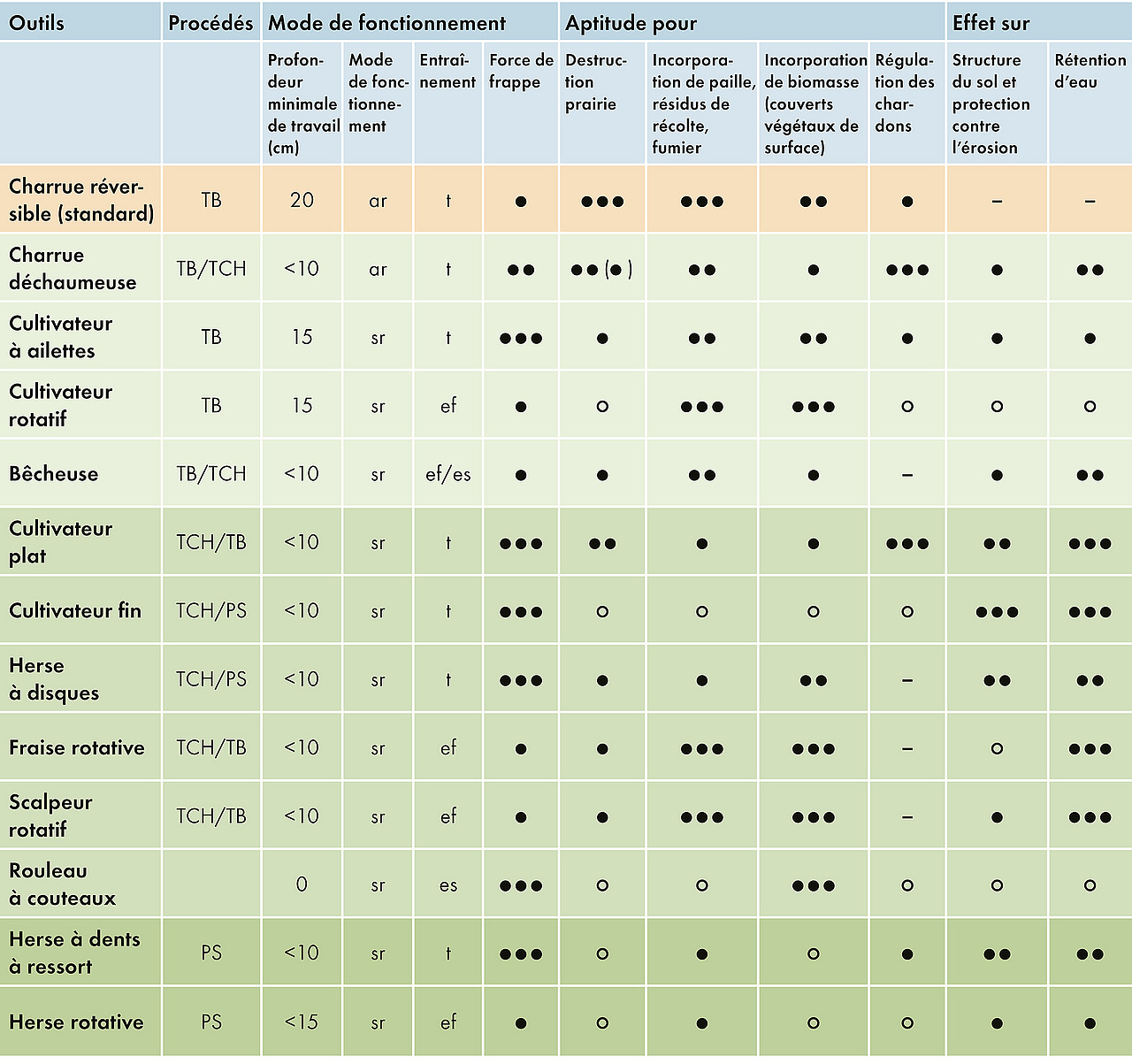 Le travail du sol comprend traditionnellement le mélange et l'ameublissement du sol jusqu'à une profondeur de 15 à 25 centimètres. À l'aide d'une charrue ou d'un cultivateur, les résidus de récolte, les adventices et les engrais de ferme doivent être incorporés dans le sol. L'incorporation peut se faire avec ou sans retournement, à l'aide d'outils traînés ou entraînés par prise de force. Dans le cas d'un travail réduit du sol, on re nonce au travail du sol profond à plus de 10 cm avec la charrue réversible traditionnelle.