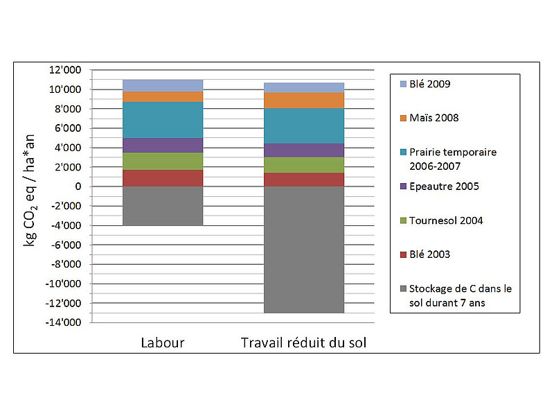 Dans les essais pratiques, le travail réduit du sol a émis 13 % de moins de CO2 et a consommé 16 % de moins d’énergie qu’en labour, malgré le fait qu’un labour a été remplacé par en moyenne 1.5 interventions avec diverses machines de travail superficiel. Le travail réduit a donné le même nombre d’heures de travail total que le labour. Le bilan climatique de l’essai de Frick a été calculé (voir schéma). L’augmentation de la teneur en humus provoquée par le travail réduit du sol a entraîné un stockage d’importantes quantités de CO2 dans le sol (partie du graphique située en-dessous de la ligne zéro) ; ces quantités sont plus élevées que celles émises par toutes les interventions culturales (machines, carburant, fertilisants, …) qui se trouvent en-dessus de la ligne zéro. Le bilan écologique a donc été positif, alors qu’il a été négatif pour la culture sur labour.