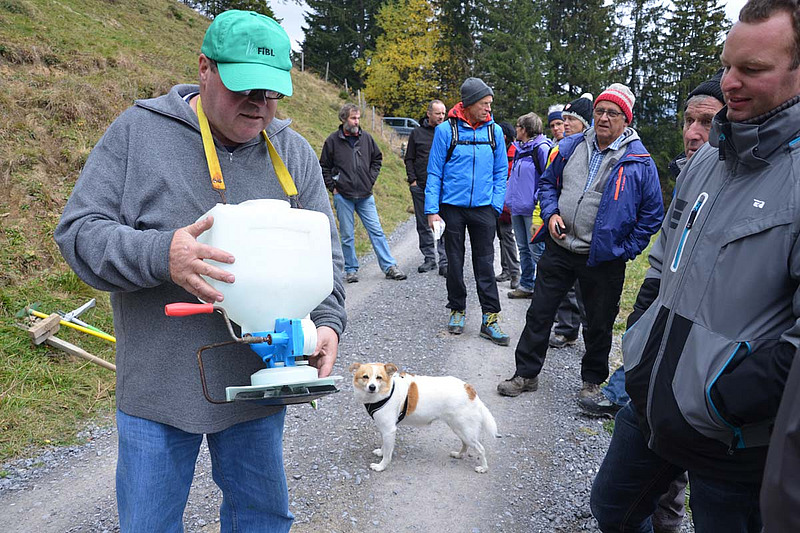 La progression de l’embuissonnement de cet alpage du canton de Schwytz était impressionnante. À ce stade les plantes problématiques ne se contentent pas de faire baisser les rendements, elles menacent aussi de faire diminuer les contributions pour l’estivage et même de provoquer un dézonage. Cette dernière mesure signifie que le pâturage est cadastré comme forêt et qu’il est désormais totalement exclu de l’exploitation agricole. Le cours sur les possibilités de lutter contre les plantes problématiques dans les alpages, qui avait été organisé de son propre chef par Franz J. Steiner (vulgarisateur du FiBL pour la production animale) tellement il était consterné par la situation, a démontré comment on peut contenir cette végétation sauvage.