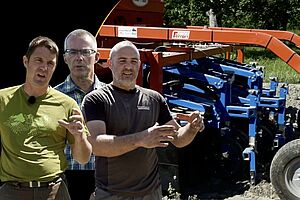 Dans une autre vidéo, Toni Büchler, agriculteur bio, explique sa stratégie de désherbage à l’aide d’un tracteur de montagne. Son tracteur est polyvalent et est utilisé sur l'exploitation non seulement pour biner ses cultures d'herbes aromatiques, mais aussi pour d'autres travaux agricoles comme le fauchage, l'andainage ou l'épandage de lisier.. Le grand avantage de cette machine est qu’elle travaille de manière fiable même sur les terres en pente. La bineuse présentée est un assemblage maison de différents outils. Elle est attelée au relevage avant du tracteur. Le châssis de la construction provient de la société Schmotzer, les parallélogrammes ont été fabriqués par l’entreprise Bärtschi. Les socs à pattes d’oie font partie de l’équipement standard et peuvent être combinés avec d’autres outils. Initialement, l’agriculteur avait utilisé des dents (bineuse à torsion), qu’il a toutefois remplacées il y a trois ans par des étoiles (bineuse à doigts) de la société Kress, plus efficaces.