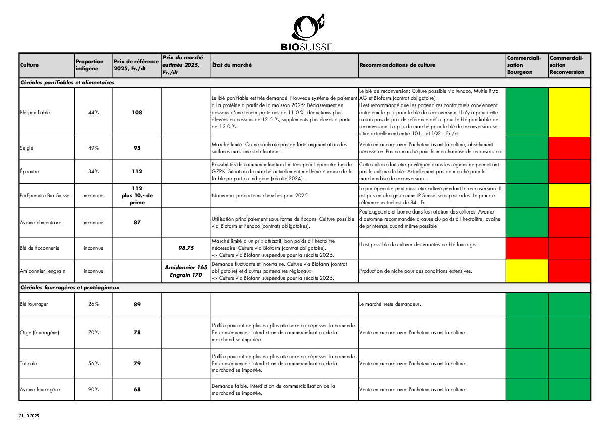 La demande est actuellement particulièrement forte pour le blé panifiable, la betterave sucrière, le blé fourrager, le maïs grain, les légumineuses à graines fourragères et les fourrages grossiers. Bio Suisse cherche pour cette raison de nouveaux producteurs et productrices dans le cadre d’une Offensive Grandes cultures. Pour plus d’informations, voir : www.bio-suisse.ch/grandescultures