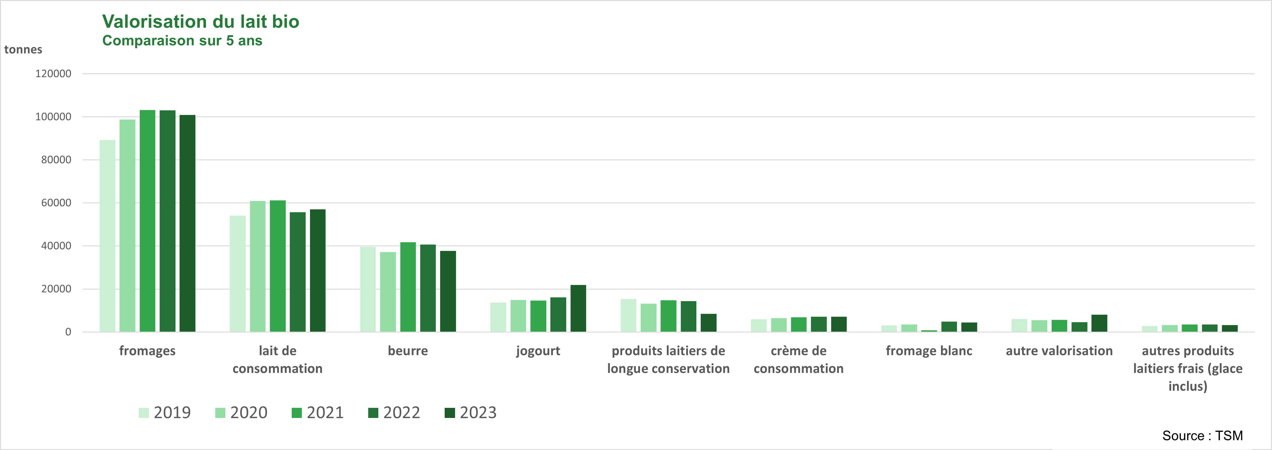 Le lait bio est principalement transformé en fromage, en lait de consommation et en beurre. En 2023, la production dans les trois catégories était à peu près au même niveau que l'année précédente. Le lait de consommation continue d'être sous pression, les consommateurs bio se tournant de plus en plus vers des alternatives végétales.