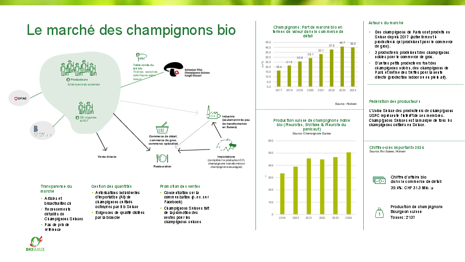 Une grande partie de la production suisse de champignons biologiques est commercialisée auprès des consommateurs finaux, tandis que seule une petite partie est vendue à la restauration ou transformée.