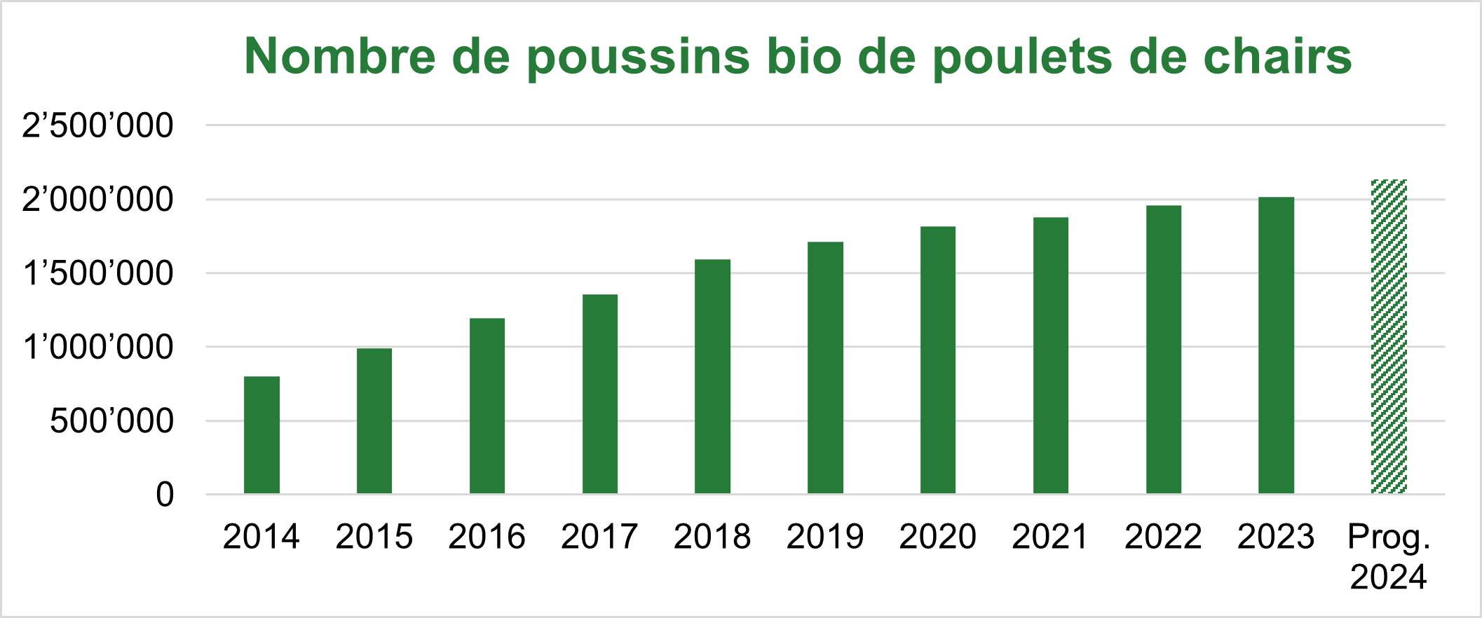 La croissance du marché du poulet bio qui a caractérisé ces dernières années se poursuit cette année. Malgré l’augmentation continue des ventes, le poulet bio reste encore un produit de niche puisque sa part de marché se trouve toujours dans le bas des pourcentages à un chiffre (< 3 %). Un des principaux défis est la commercialisation de toute la viande des poulets: Même les consommatrices et consommateurs bio préfèrent les filets (la poitrine, le «blanc») alors que les cuisses et les ailes (le «brun») sont encore et toujours moins demandées.
