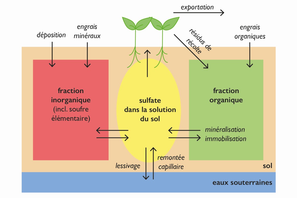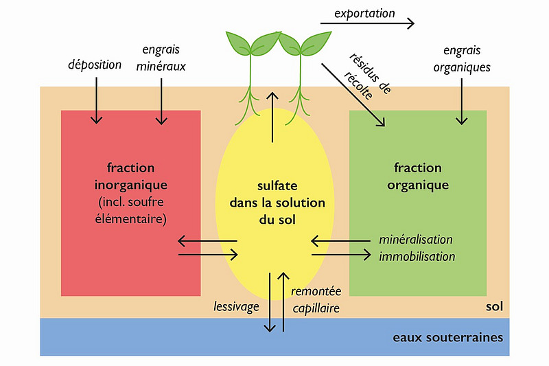Les plantes absorbent le soufre contenu dans la solution du sol sous forme d'ion sulfate (SO42-). Tout comme le nitrate, le sulfate est très mobile et migre facilement dans les couches plus profondes du sol où il est exposé au lessivage. Inversement, la remontée capillaire du sulfate à partir des couches profondes du sol est également possible.
