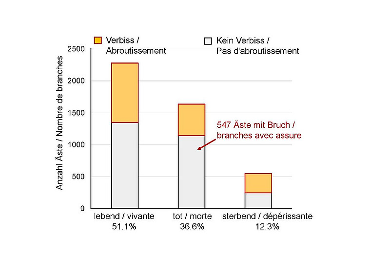 Illustration 2. État des branches d’aulne vert en 2020 (après 4 ans de pâture): 4 464 branches d’aulnes verts ont été examinées. Si l’on regroupe les branches mortes et les branches mourantes, près de la moitié des branches étaient mortes. Illustrationen: zVg. Kleinwiederkäuer Forum