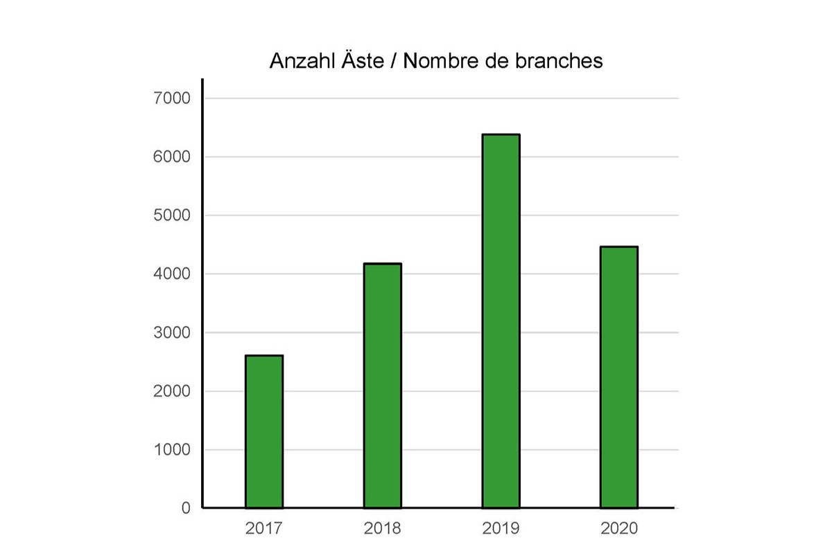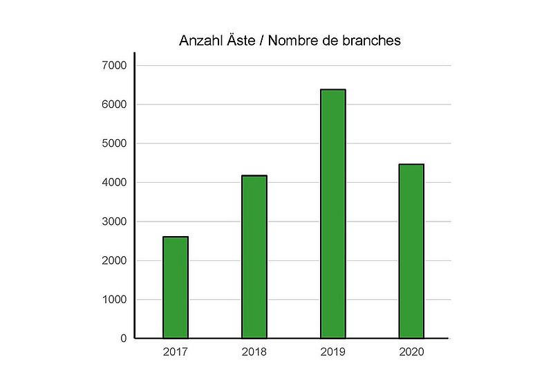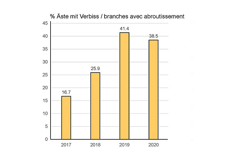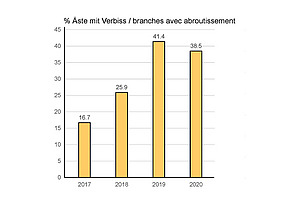 Durant la période définie, un total de 17 627 branches d'aulnes verts ont été évaluées en fonction des traces d'abroutissement ou d'écorçage laissées par les moutons de l'Engadine, mais aussi de la vitalité de la branche (vivante, dépérissante, morte). Après la première saison de pâture avec «juste» 190 moutons, des traces d'écorçage ont été constatées sur environ 16.7 pourcent des branches d'aulnes verts (illustration 1A et 1B). Lors du dernier relevé (2020), 38.5 pourcent des branches examinées présentaient des traces d'abroutissement et près de 50 pourcent des branches d'aulnes verts étaient mortes ou en train de mourir (illustration 2). Au niveau du paysage, la régression de l'embroussaillement par les aulnes verts était clairement visible sur les photos prises par les drones. Même des buissons très denses ont été ouverts après trois à quatre ans de pâture.