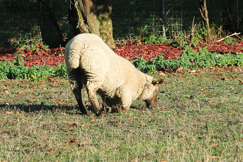 Un mouton souffrant du piétin présente à cause de la douleur un comportement alimentaire typique: Il «s’agenouille» sur les carpes pour décharger les onglons de devant. Photo: BGK, Sven Dörig