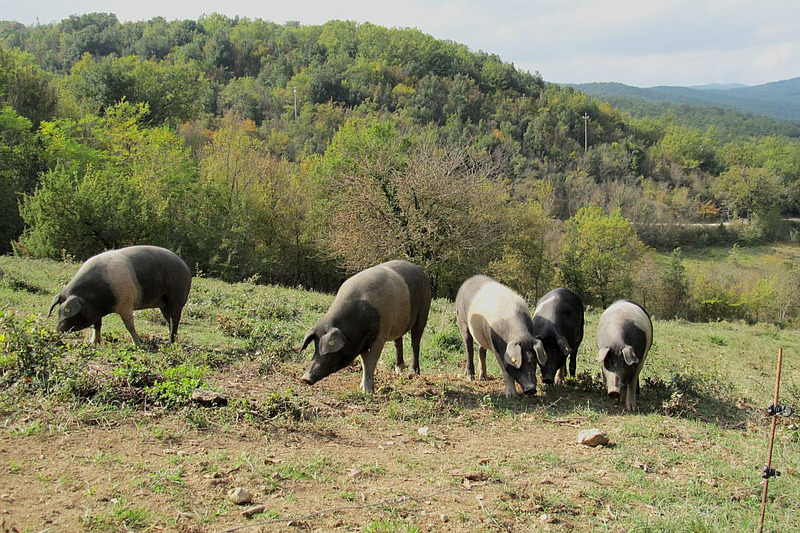 Dans l’élevage extensif de plein air d’une ferme italienne, les dix truies de la race Cinta Senese et leur verrat vivent toute l’année dans une grande oliveraie. Pour assurer la protection contre les prédateurs, les naissances et les premières semaines de l’allaitement se passent dans une porcherie avec parcours bétonné et accès à du terrain ouvert. Pendant la période de végétation, les porcs à l’engraissement pâturent sur les terres assolées qui se trouvent autour de la porcherie et peuvent donc trouver différentes plantes fourragères directement au pâturage. On les change de parcelle après deux semaines. Ils passent les mois d’hiver dans une grande zone clôturée qui comporte des buissons et des arbres. Il est prouvé que la grande proportion de fourrage vert augmente la teneur en acide linolénique du lard de dos et de la chair musculaire.