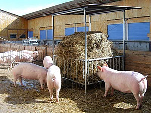 Les râteliers à fourrages grossiers doivent permettre à toutes les truies de manger en même temps. La distance entre les barreaux doit être assez grande pour que les porcs puissent prélever facilement les fourrages et assez petite pour éviter les trop grandes pertes de fourrages. Pour les truies, des distances de 11 à 13 centimètres sont recommandées.