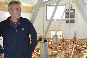 Le producteur fribourgeois de poulet bio Laurent Godel a développé un système de poulailler d’un nouveau genre qui respecte le Cahier des charges de Bio Suisse et diminue un peu le travail.