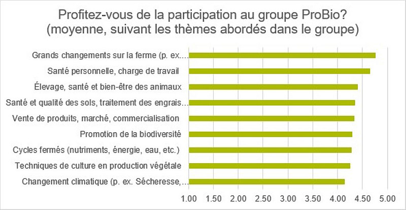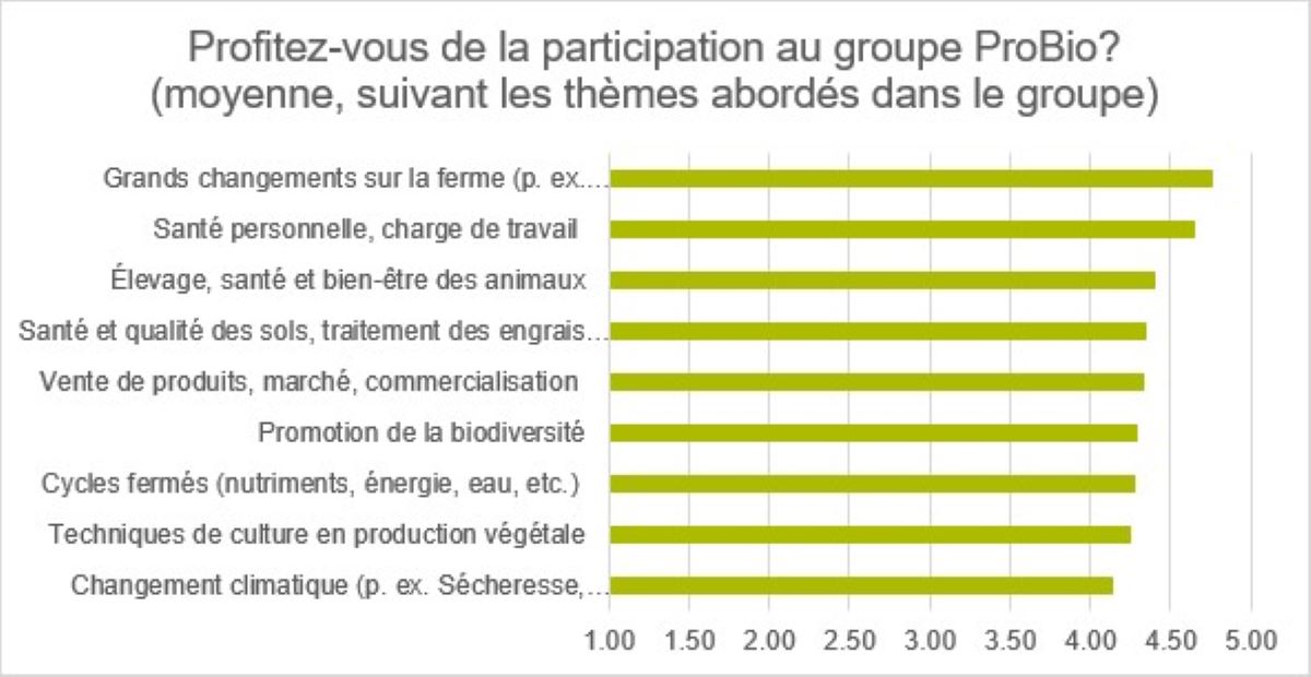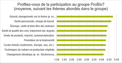 Tout d'abord, 40 pour cent des sondés affirment qu'ils et elles profitent des groupes et 45 pour cent qu'ils profitent entièrement, ce qui justifie entièrement l'utilité des groupes. Les groupes permettent aux participants d'avoir accès à d'autres exploitations, de rompre avec leurs propres certitudes, mais aussi de partager leurs expériences. Ils sont particulièrement utiles pour traiter des thèmes liés à la santé et à la qualité des sols ainsi qu'aux traitements des engrais de ferme. L'élevage, la santé et le bien-être des animaux ainsi que les techniques culturales sont également des thématiques traitées efficacement. Mais ils ont aussi une dimension sociale très forte, car nous avons pu constater par exemple que les personnes qui sont confrontées à des changements importants dans leur exploitation ou qui sont préoccupées par leur santé personnelle ou par leur charge de travail tirent le plus grand bénéfice de leur participation. Pour la suite, les résultats montrent qu'il faut qu'on arrive à apporter plus de soutien pour traiter notamment les thématiques liés au climat ou à la gestion de cycles fermés sur la ferme.
